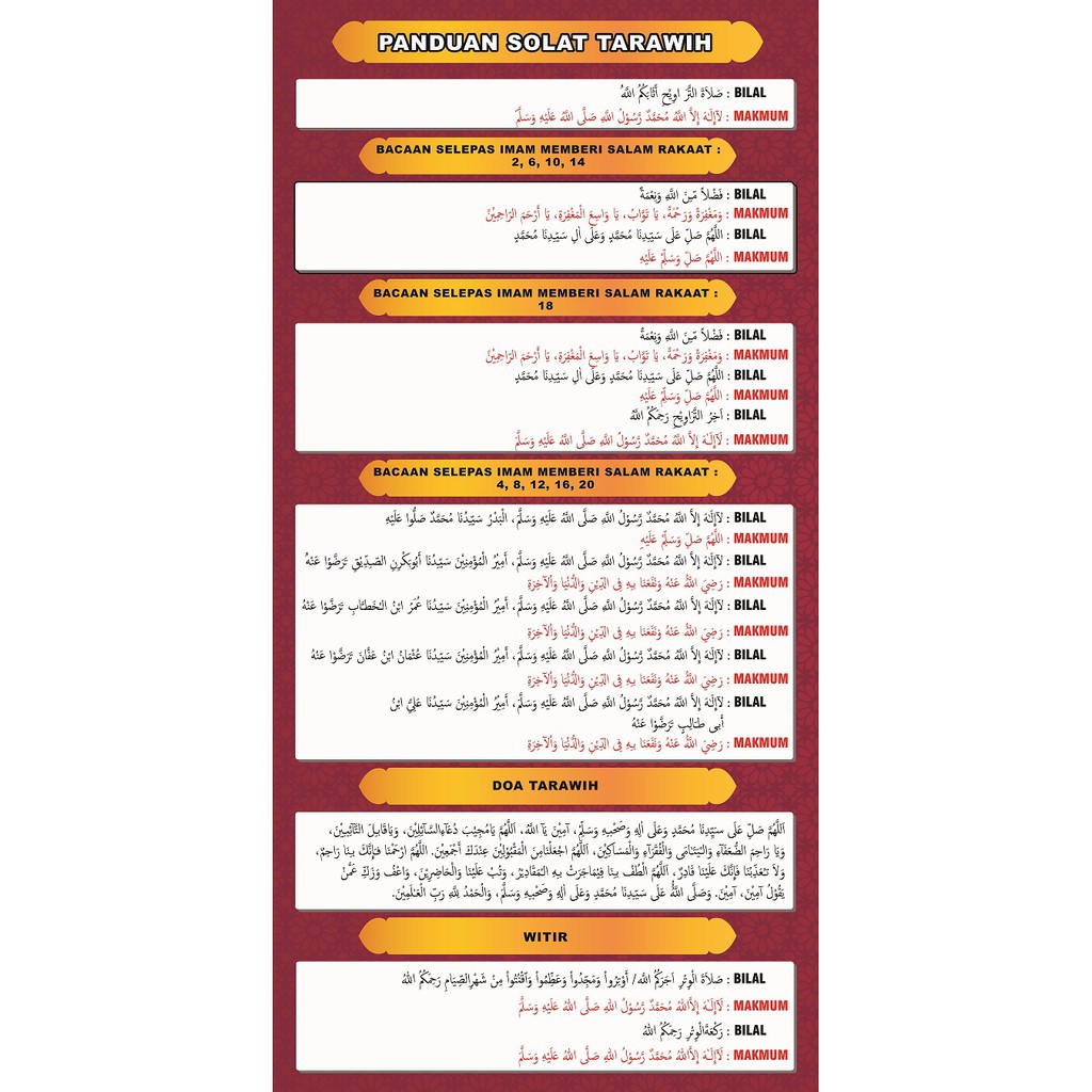 Hukum membaca selawat dan taradhi (menyebut . Apabila selesai mendirikan 8 raka'at solat tarawih, membaca doa berikut; Di samping diselangi dengan zikir dan selawat sebelum didirikan 4 rakaat lagi. Solat 2 rakaat seperti biasa. Tetapi ada juga yang hanya menunaikan sekadar 8 rakaat sahaja. Zikir solat tarawih 8 rakaat by cikgu zie #mathssenangdidunia. Bacaan oleh halim ahmad0:02 bacaan pembukaan1:22 surah rakaat pertama & kedua1:29 bacaan bilal selepas rakaat kedua2:31 surah rakaat ketiga . Sembahyang sunat tarawih ditunaikan seperti solat sunat biasa,. View panduan dan tatacara solat sunat tarawih 8 rakaat, doa, zikir & selawat serta solat sunat witir.pdf from faculty sc hs08 at university of malaysia . Wirid & doa penutup selepas witir; Home · panduan dan tatacara solat sunat tarawih 8 rakaat, doa, zikir & selawat serta solat sunat witir . Panduan dan tatacara solat sunat tarawih 8 rakaat, doa, zikir & selawat serta solat sunat witir. • 1 like • 1,143 views.